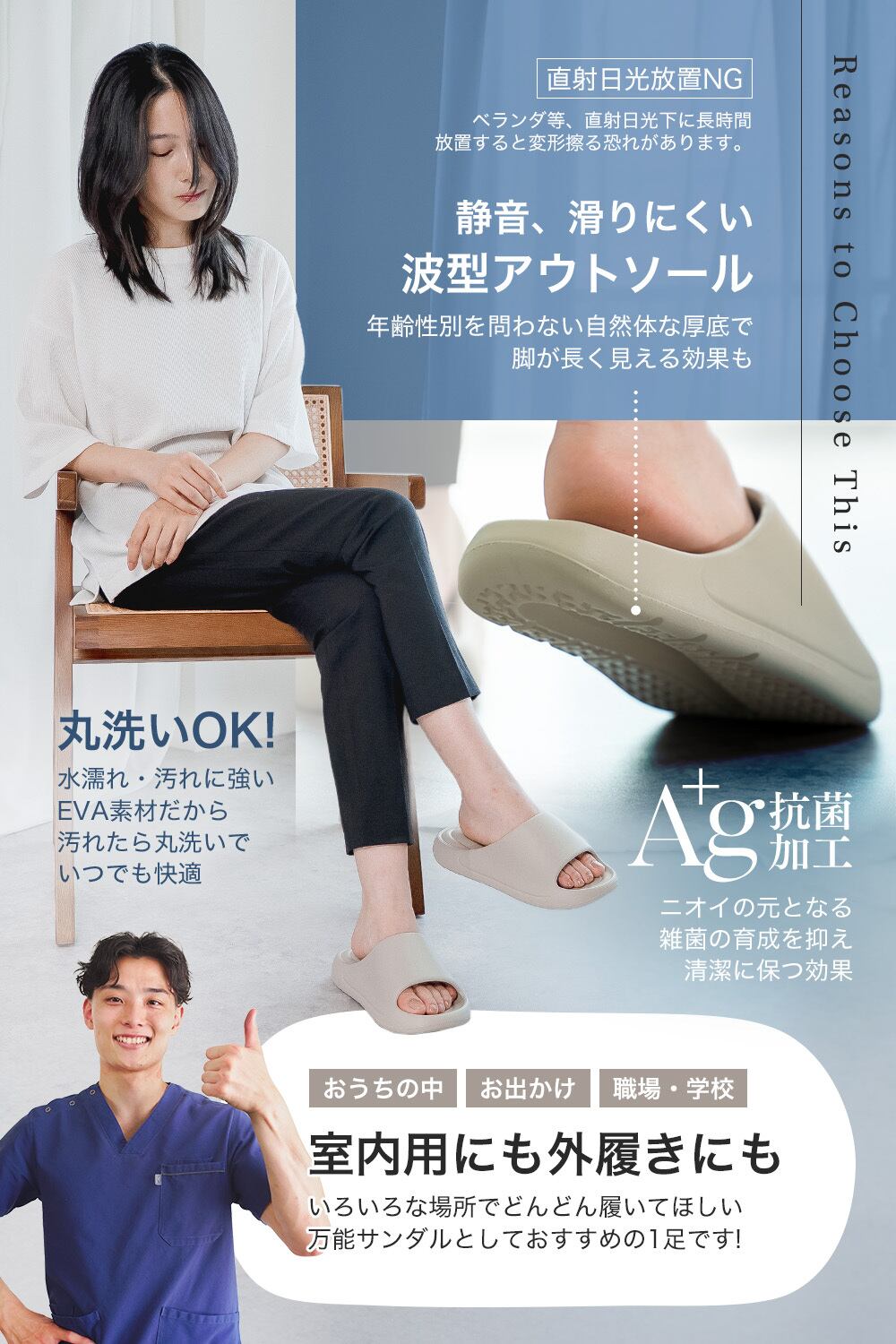 足を快適に保つ通気性の良いサンダルです。軽量なEVA素材が衝撃を吸収し、長時間履いても疲れにくい仕様。水はけの良い構造なので、濡れた場所でも安心です。Ag+銀イオンの抗菌防臭加工で、清潔な状態が続きます。滑りにくい波状のアウトソールで安全性を高め、汚れたらサッと水洗いするだけ。室内外問わず、様々なシーンで活躍する万能サンダルです。